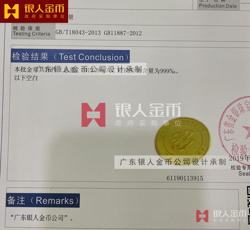 答:可以的。我公司所有金銀制品純度為99.9%及以上,成色達到國家法定黃金白銀的成色標準,檢測報告以廣東省質監局金銀珠寶檢測中心或國家金銀制品質量監督檢驗中心(上海)出具檢測報告為準。為所有客戶定做金銀紀念章,最終都會經過上述國家權威部門金銀品質檢測檢驗合格后、方可交貨給您手上。
