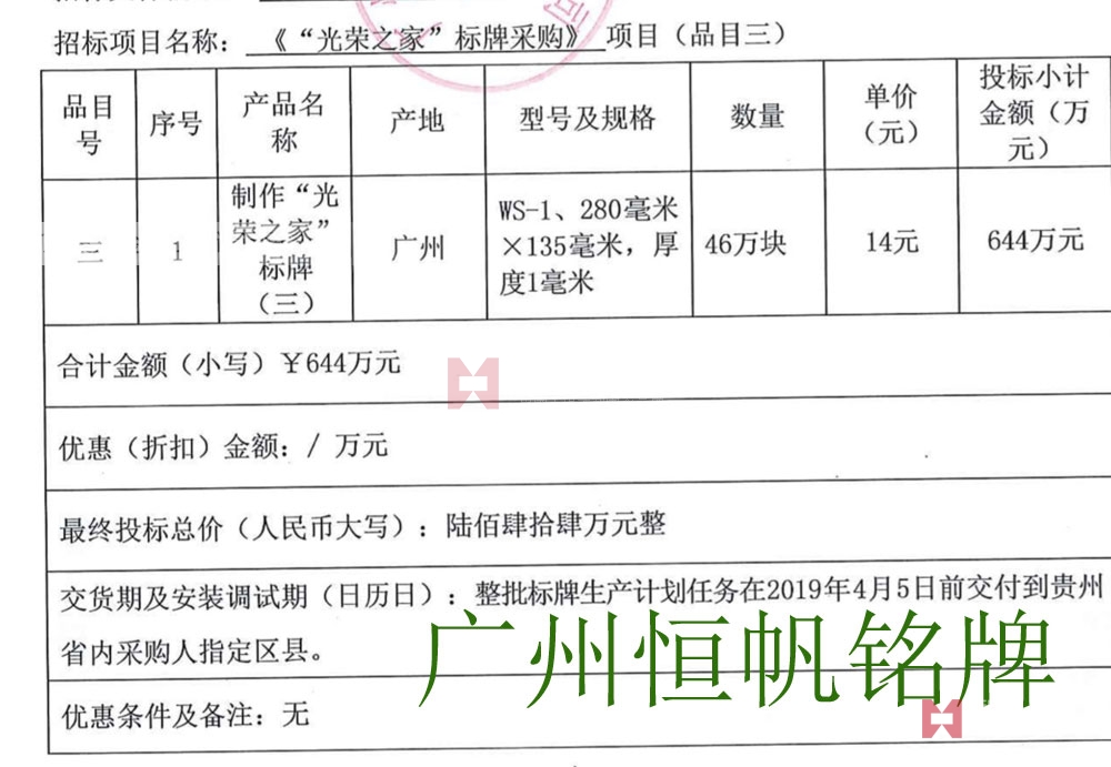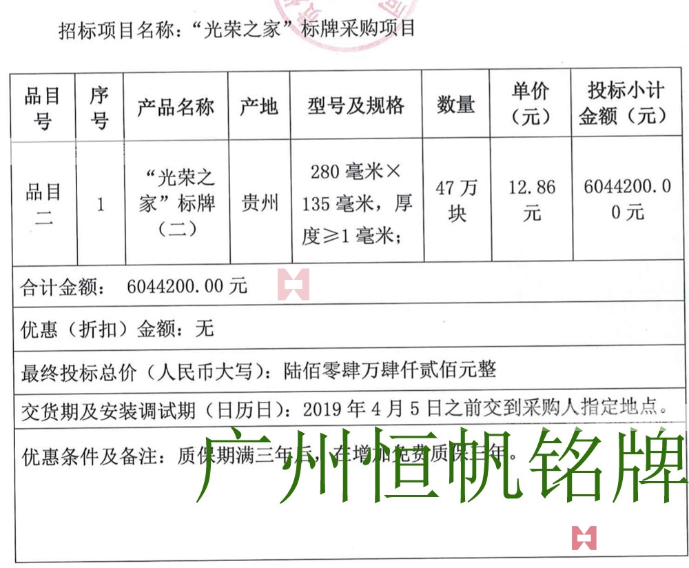 頒發(fā)授予光榮之家牌匾/光榮牌采購(gòu)需求