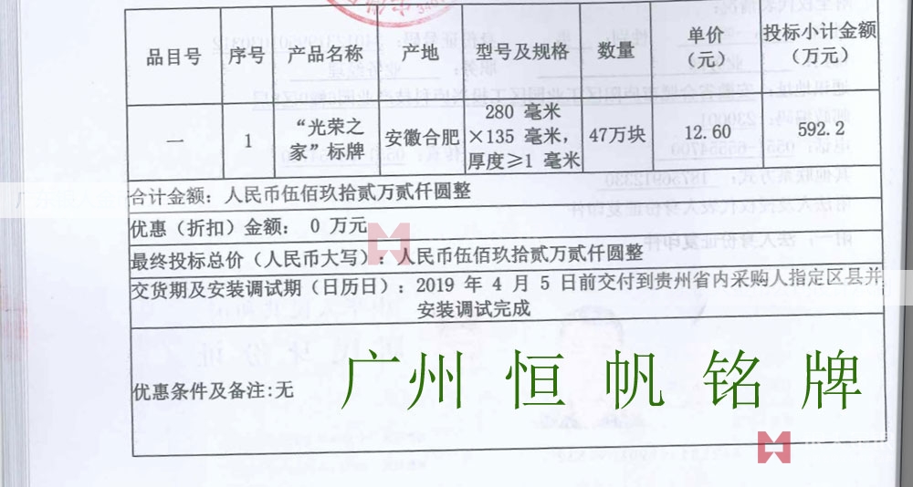 光榮牌制作樣品1塊(標(biāo)明材質(zhì)及成分含量)。最終交付的產(chǎn)品必須符合技術(shù)規(guī)范參數(shù)。