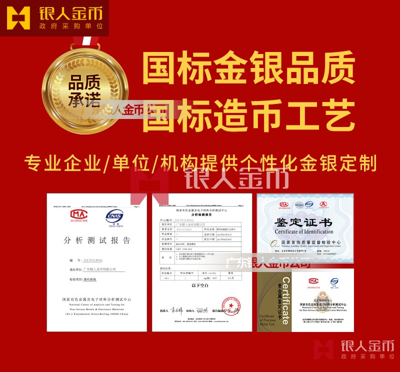廣東銀人金幣公司承接客戶個性化定制的金銀幣、金銀章、金銀條、金銀牌、金銀盤均由國家質監部門、嚴格檢測、權威鑒定: