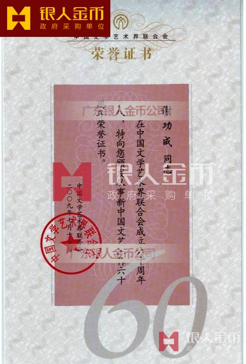 中國(guó)文聯(lián)從事新中國(guó)文藝工作六十年表彰紀(jì)念章獎(jiǎng)?wù)聞渍聵s譽(yù)證書(圖)