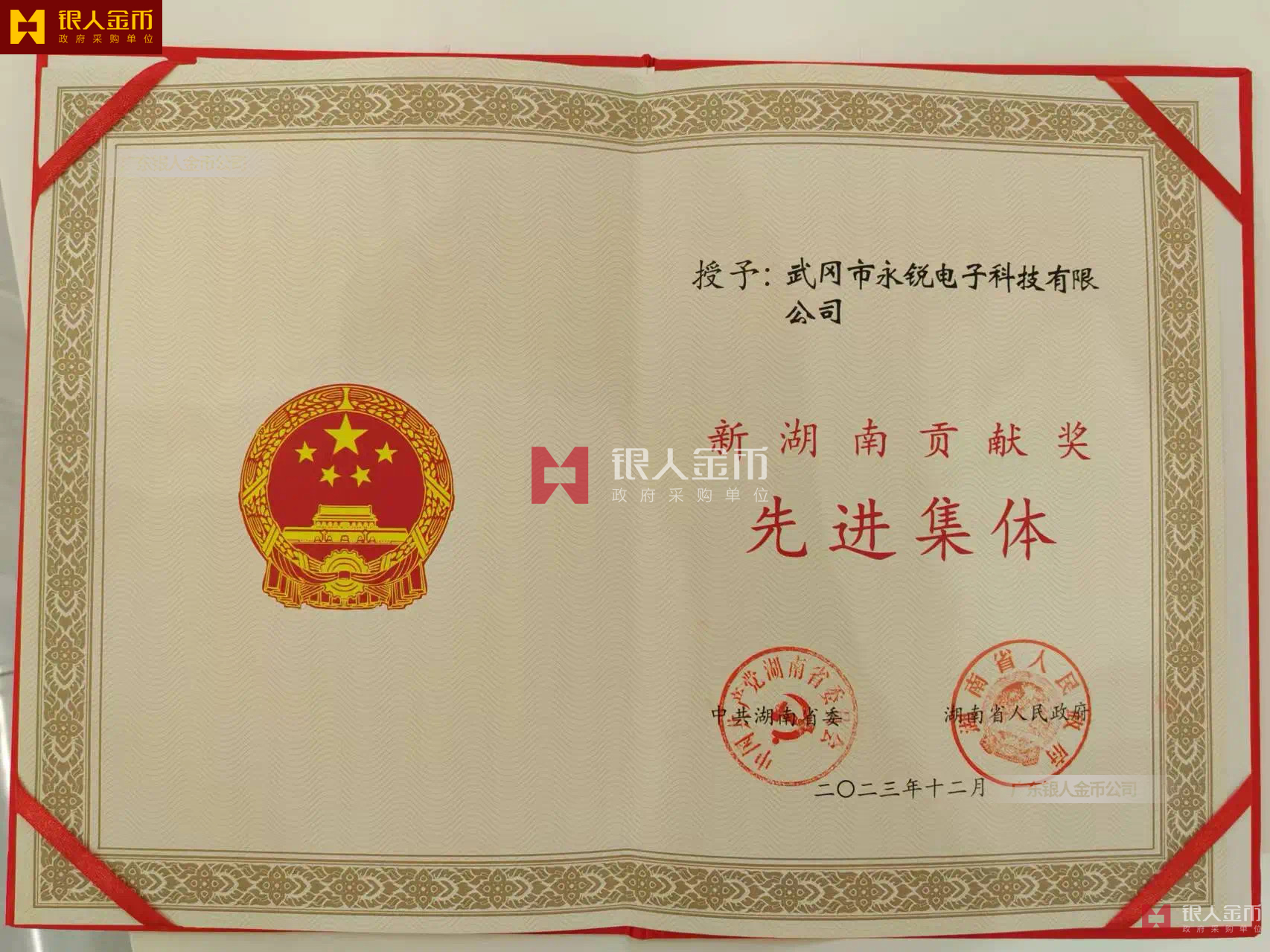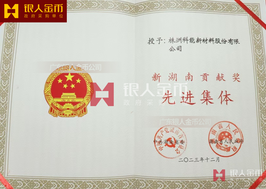 中共湖南省委、湖南省人民政府——新湖南貢獻獎先進集體證書(榮譽證書、獎勵證書)