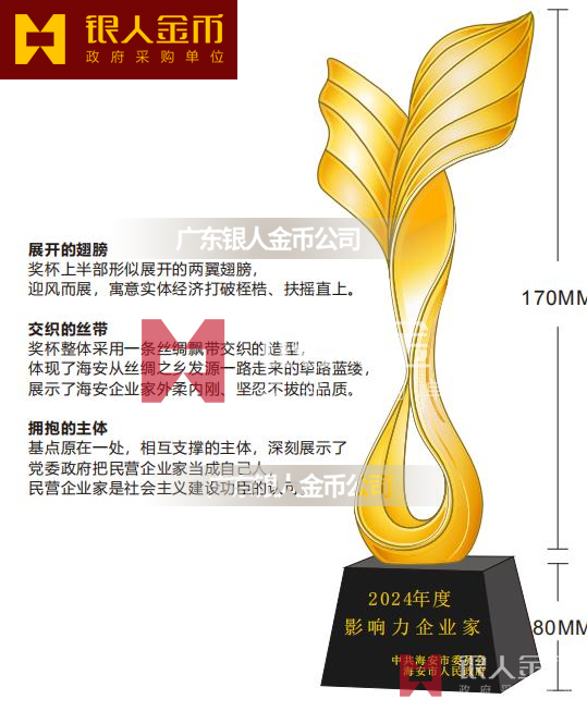 影響力企業家金制工藝品為黑色木質或人造黑水晶底座加金杯(工藝品黃金部分)。(2)金杯(工藝品黃金部分)的克重為99克,高度約17厘米,樣式按采購方供圖(詳見第1條)。(3)底座高度約8厘米,刻字,共有2種類型。(4)每個影響力企業家金制工藝品提供透明材質外罩和木質精美底座。