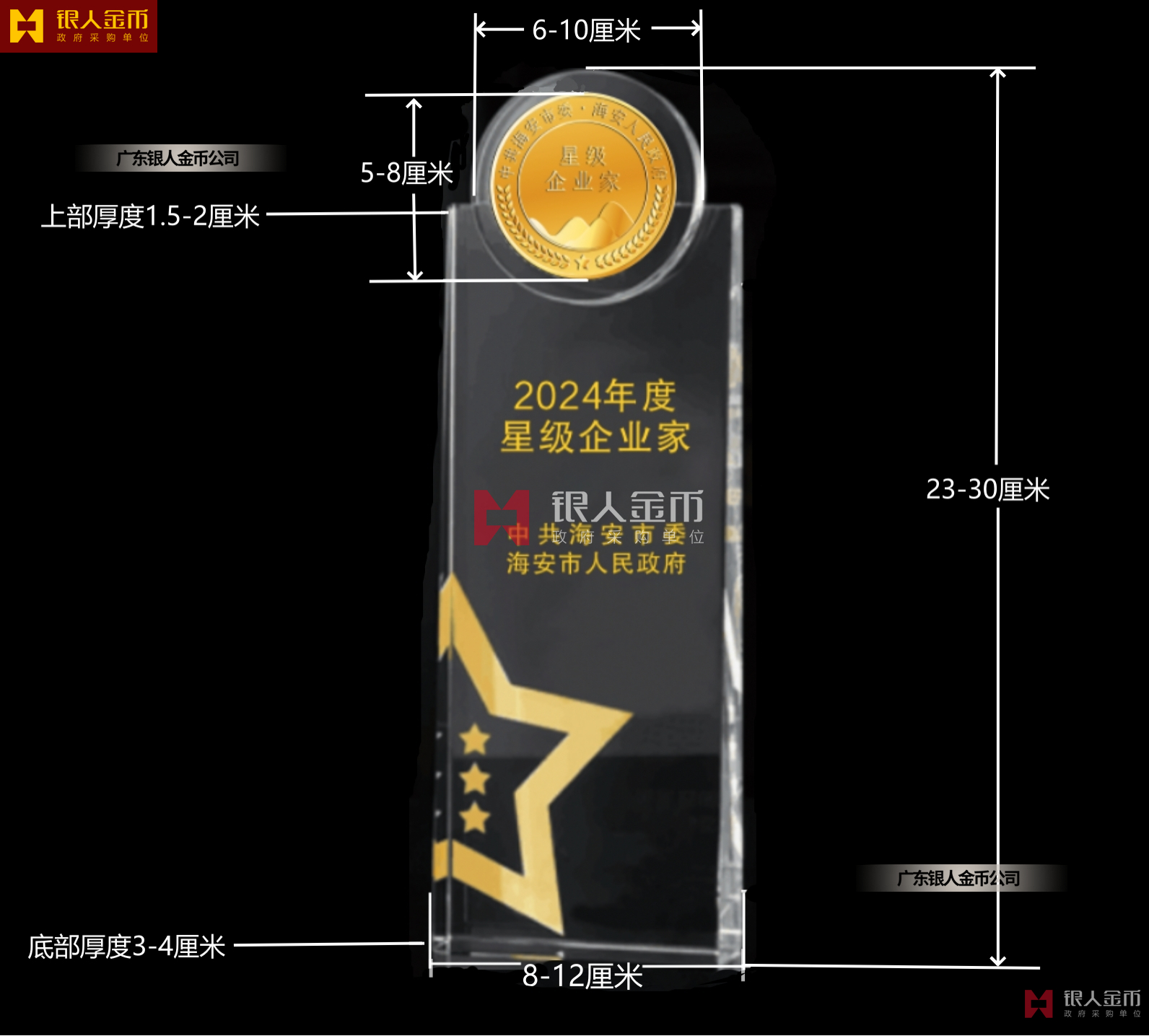 (2)人造水晶底座和金幣正面圖案,金幣背面為龍圖案(浮雕)、黃金純度和克重,(3)金幣的克重分別為:六星級200克,五星級140克,四星級100克,三星級80克,二星級60克,一星級50克。(4)金幣直徑為5-8厘米。(5)人造水晶整體高度23-30厘米,寬8-12厘米,底部厚度3-4厘米,上部厚度1.5-2厘米。(6)每個產品木質精美包裝盒(盒面印制標識“中共海安市委 海安市人民政府”)。