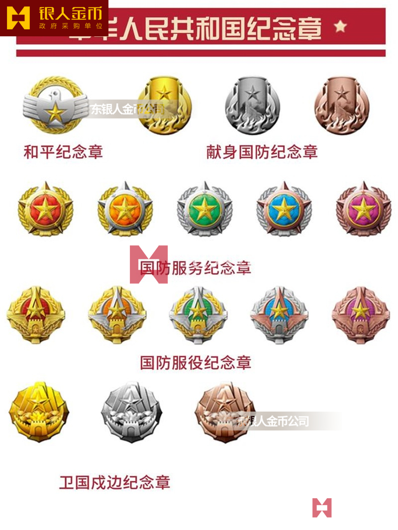 國防服務紀念章(按杰出貢獻和職務、軍兵種、服役年限分為:金質、銀質、銅質)