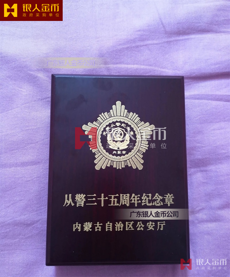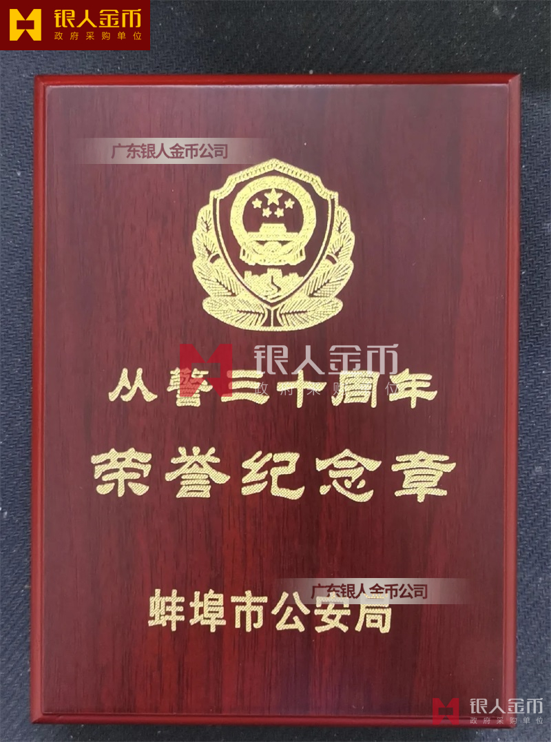 從警紀念章定制,從警年限紀念章定制,從警獎章定制——從警紀念章的底下主體部分都是警徽,上面橫檔部分是不相同的,有:“從警十年紀念(從警10年紀念章)”、“從警二十年紀念(從警20年紀念章)”、“從警三十年紀念(從警30年紀念章)”、“從警四十年紀念(從警40年紀念章)”不同的,從警十年紀念章(從警10年獎章)表面是鍍銅色(銅質獎章)、從警二十年紀念章(從警20年獎章)表面鍍銀色(銀質獎章)、從警三十年紀念章(從警30年獎章)和從警四十年紀念章(從警40年獎章)表面鍍金色(金質獎章) ,整體將從警獎章或從警紀念章(從警特定年限紀念章也叫從警章)鑲嵌在三折的立式木盒上面,木盒外面配有紙盒,整體做工精美,木盒紙盒上面都刻有警徽從警年限等。