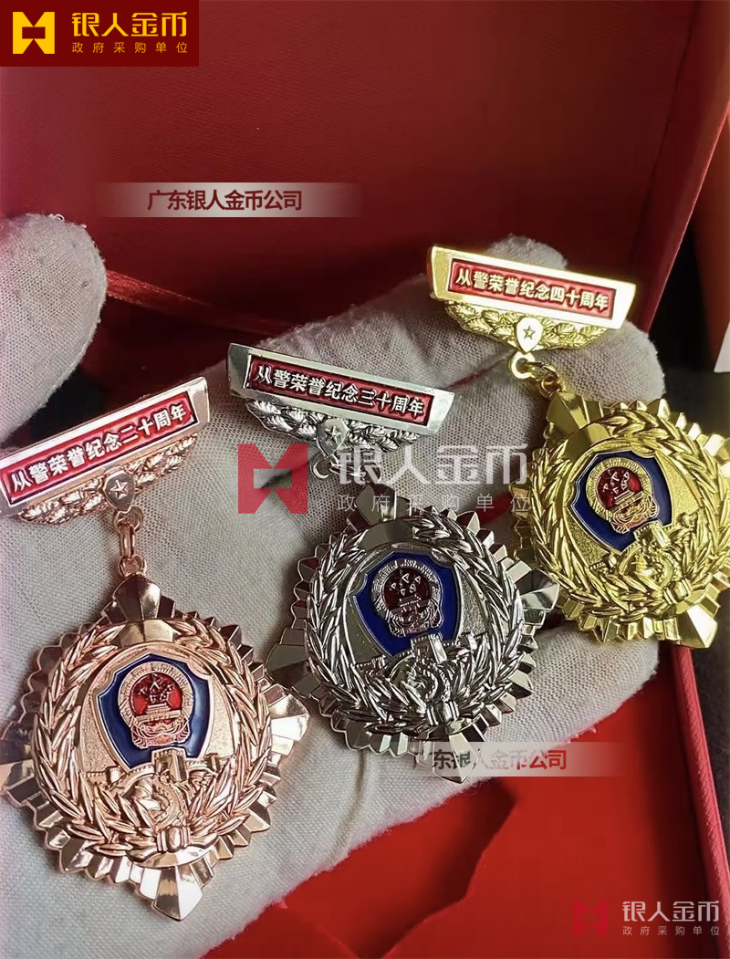 從警紀念章(公安勛章或警察勛章,也叫人民警察金盾獎章或金盾勛章),不僅是一件獎品,更是一份承載著榮譽與責任的象征,它猶如一面鏡子,映射出警察職業的崇高與莊嚴,也映射出每一位警察內心深處的信念與堅守。這款從警年限紀念章以金銀銅三色為主調分別代表不同入警時間,象征著警察職業的莊嚴與神圣。其造型獨特,融合了警徽、盾牌與時間的元素,警徽,代表著警察的身份與榮譽,每一次佩戴,都是對職責的堅守;盾牌,象征著保護與守護,是警察們面對危險時無畏前行的勇氣;而時間的流轉,則見證了警察們從青澀到成熟,從熱血到沉穩的蛻變。