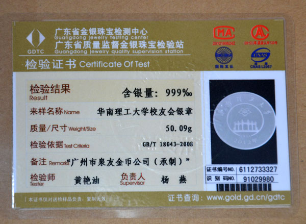 華南理工大學(xué)校友會(huì)紀(jì)念銀章檢測(cè)證書