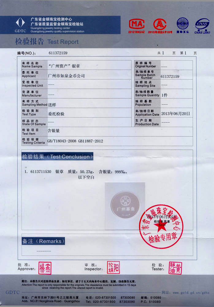 廣東省金銀珠寶檢測(cè)中心金銀幣鑒定證書