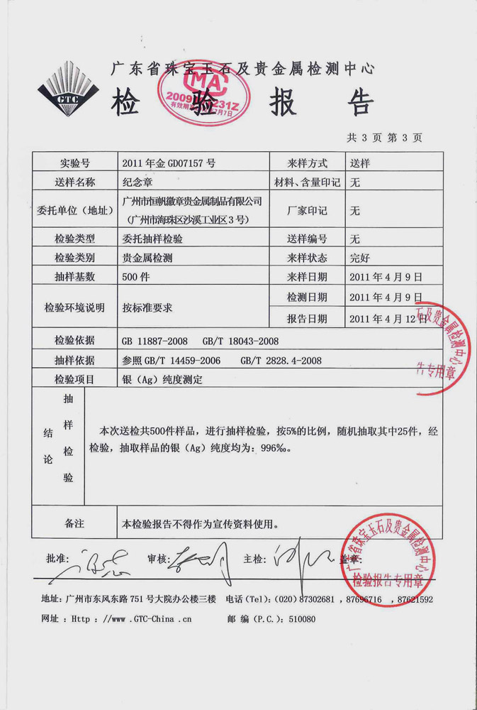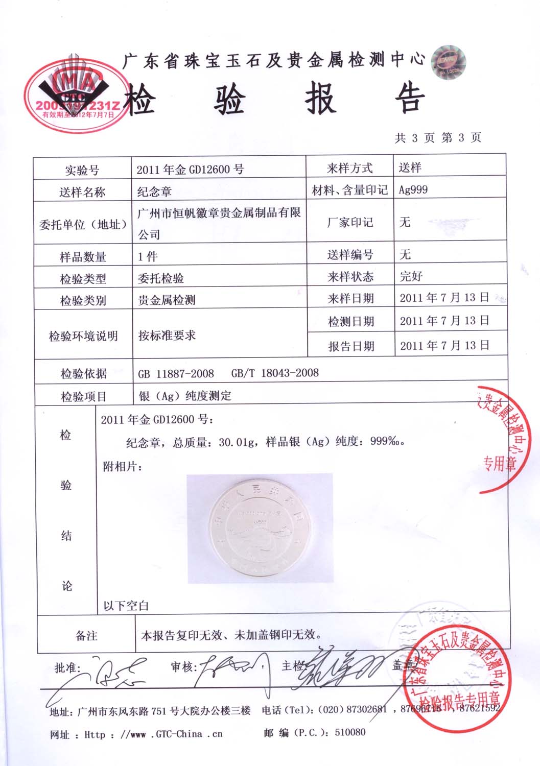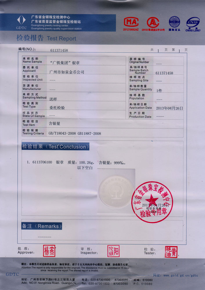 廣東省質量監督局金銀含量金銀品質鑒定證書
