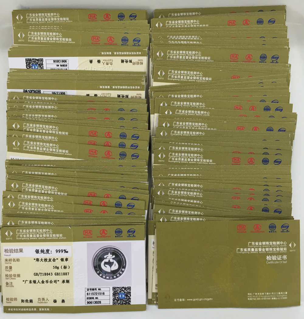 廣東省質監金銀紀念幣金銀純度鑒定證書