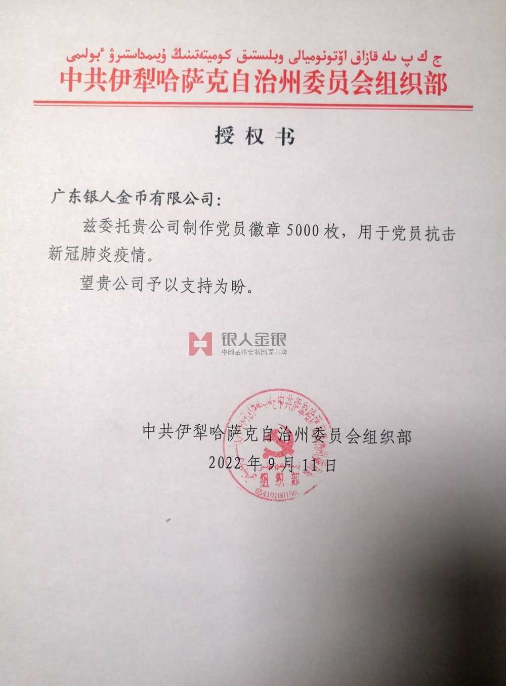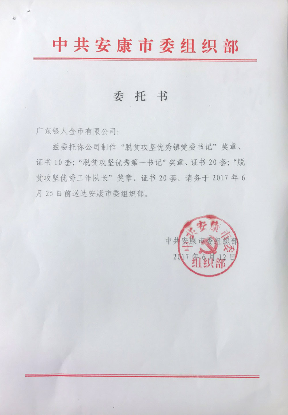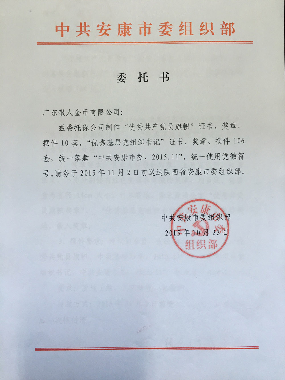 湖北省市場監督管理局訂購中組部黨徽文件公函