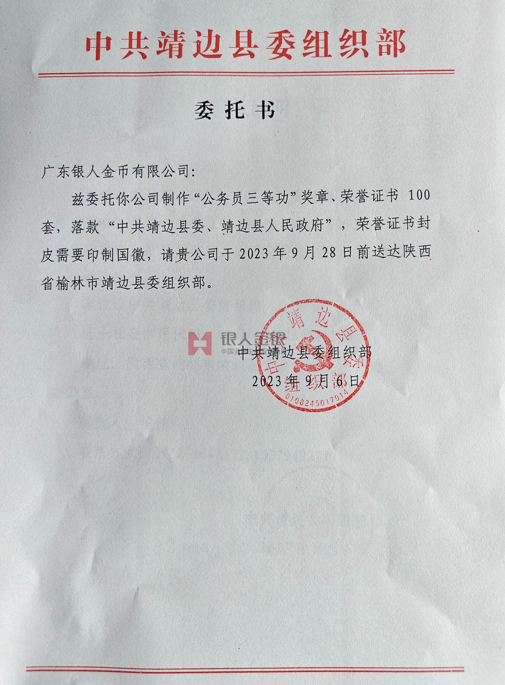 中共陜西省定邊縣委組織部公函