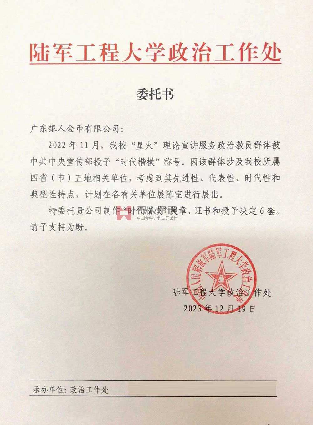 中國人民解放軍陸軍工程大學政治工作處公函