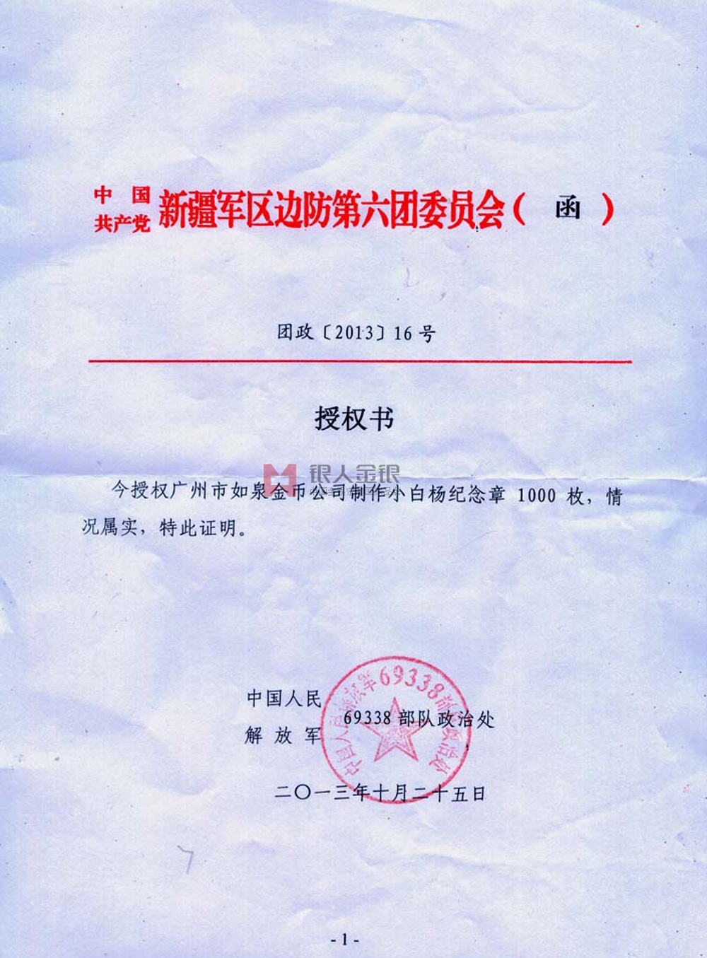 西部戰區原蘭州軍區新疆軍分區中國人民解放軍69338部隊小白楊哨所紀念章定制公函