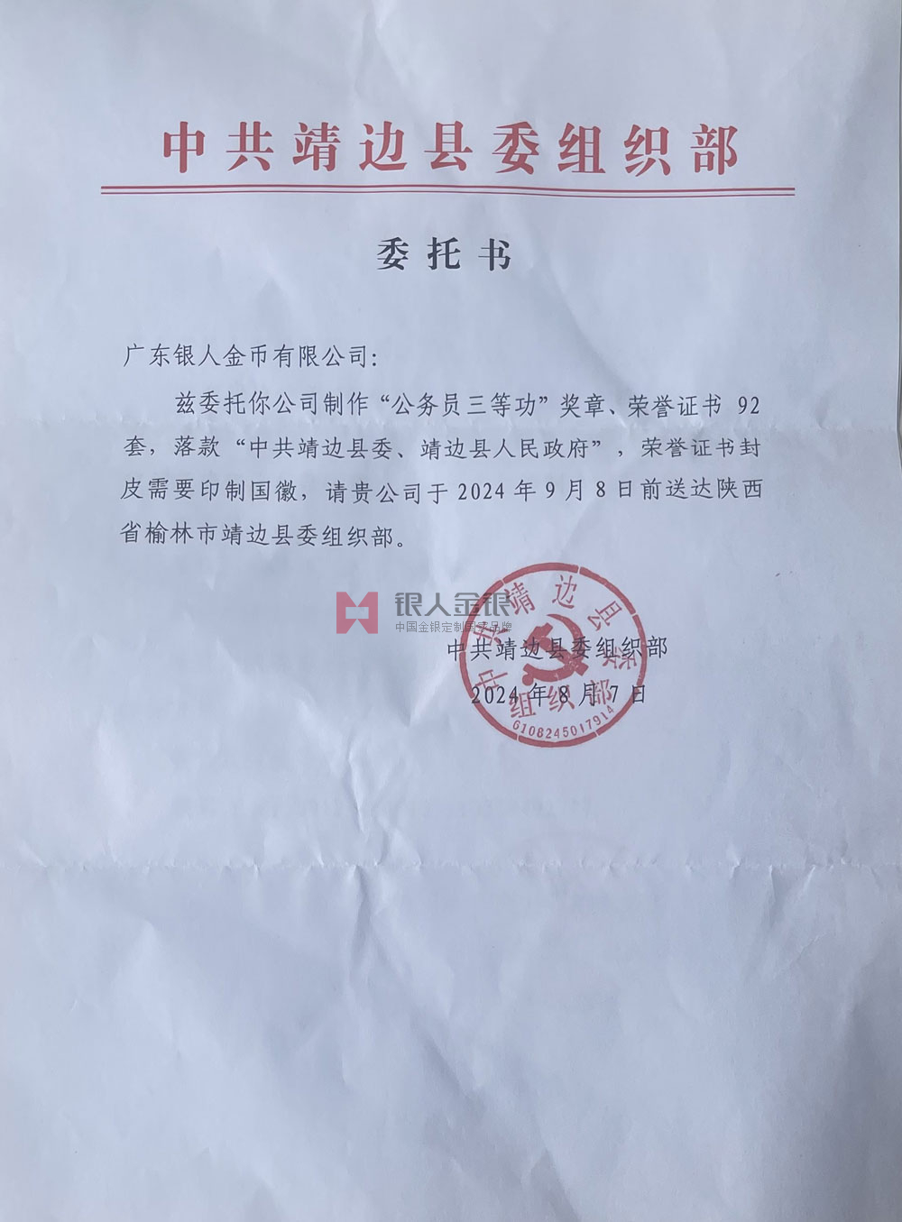 中共靖邊縣委組織部公務員三等功獎章定制公函