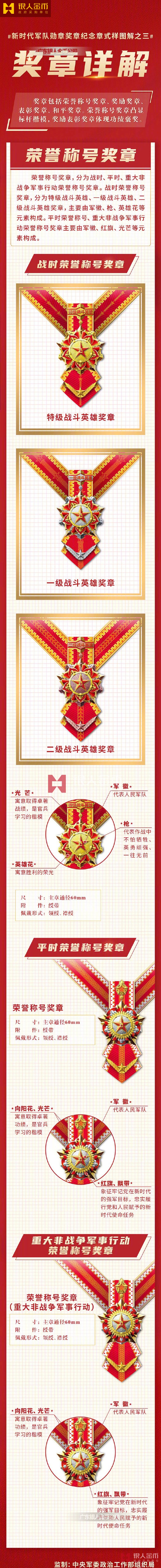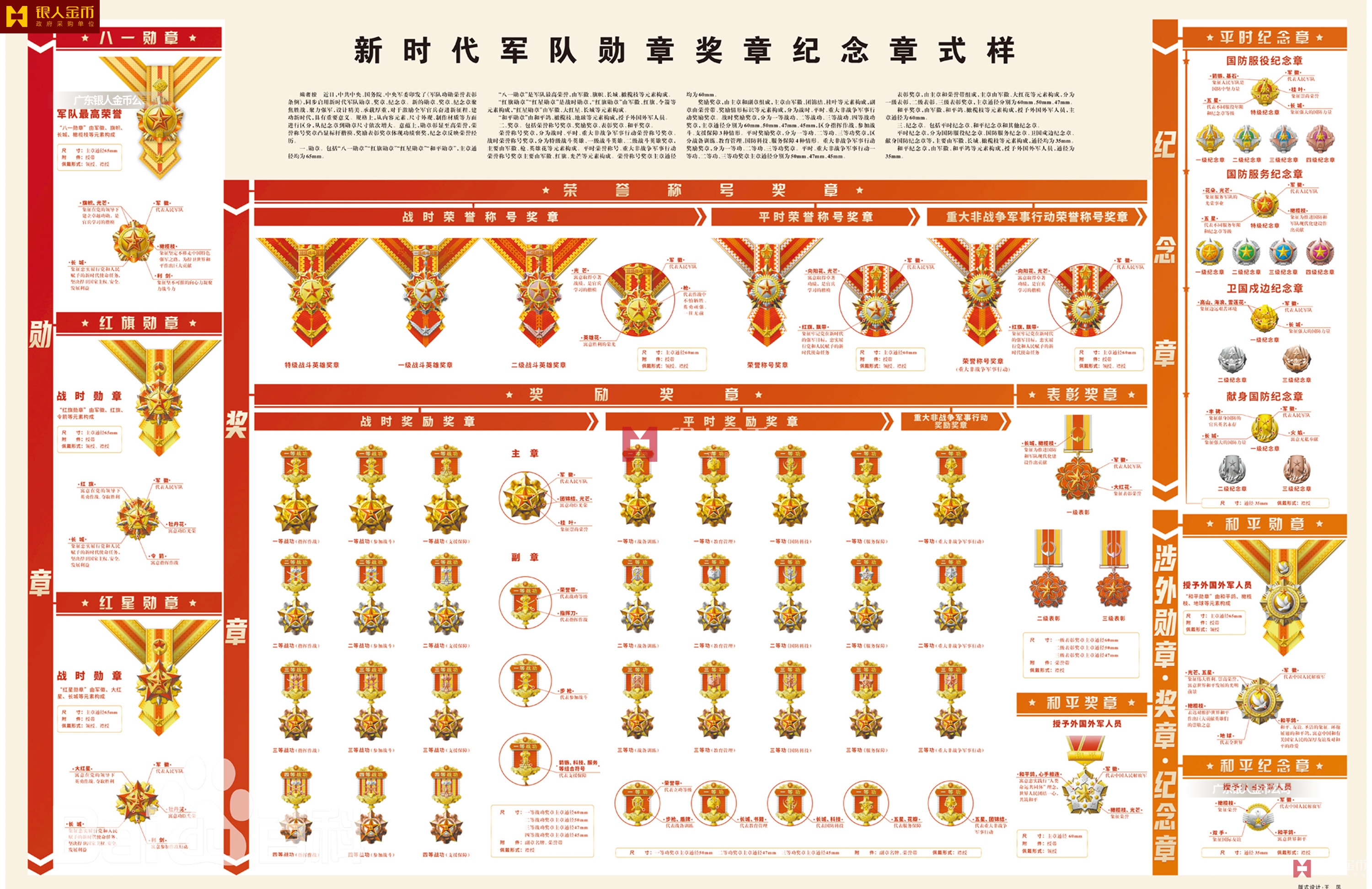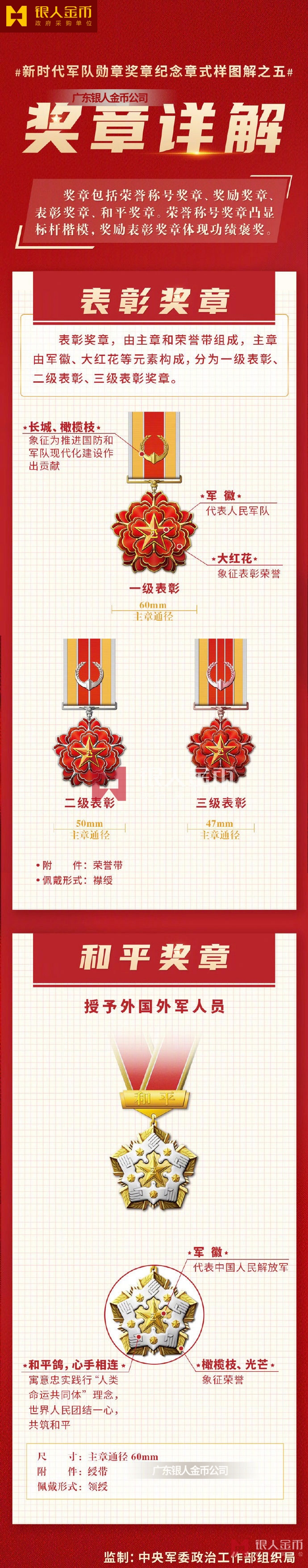 近日,《軍隊(duì)功勛榮譽(yù)表彰條例》印發(fā),同步啟用新時(shí)代軍隊(duì)勛章、獎(jiǎng)?wù)隆⒓o(jì)念章:①勛章。包括“八一勛章”“紅旗勛章”“紅星勛章”“和平勛章”,主章通徑均為65mm。②獎(jiǎng)?wù)隆0s譽(yù)稱號(hào)獎(jiǎng)?wù)隆ⅹ?jiǎng)勵(lì)獎(jiǎng)?wù)隆⒈碚锚?jiǎng)?wù)隆⒑推姜?jiǎng)?wù)隆"奂o(jì)念章。包括平時(shí)紀(jì)念章、和平紀(jì)念章和其他紀(jì)念章。中央軍委最新版新時(shí)代部隊(duì)?wèi)?zhàn)區(qū)榮譽(yù)稱號(hào)軍隊(duì)勛章、獎(jiǎng)?wù)隆⒓o(jì)念章(定制標(biāo)準(zhǔn))