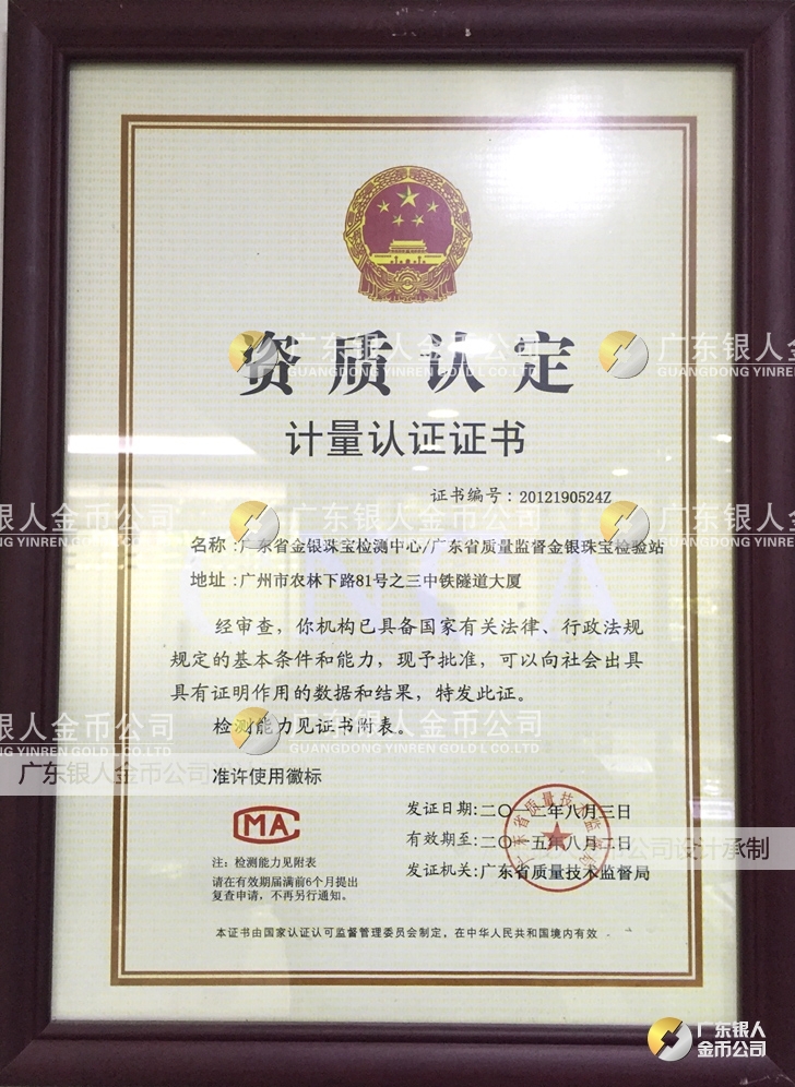 廣東銀人金幣公司承接客戶個性化定制的金銀幣、金銀章、金銀條、金銀牌、金銀盤均由國家質監部門、嚴格檢測、權威鑒定: