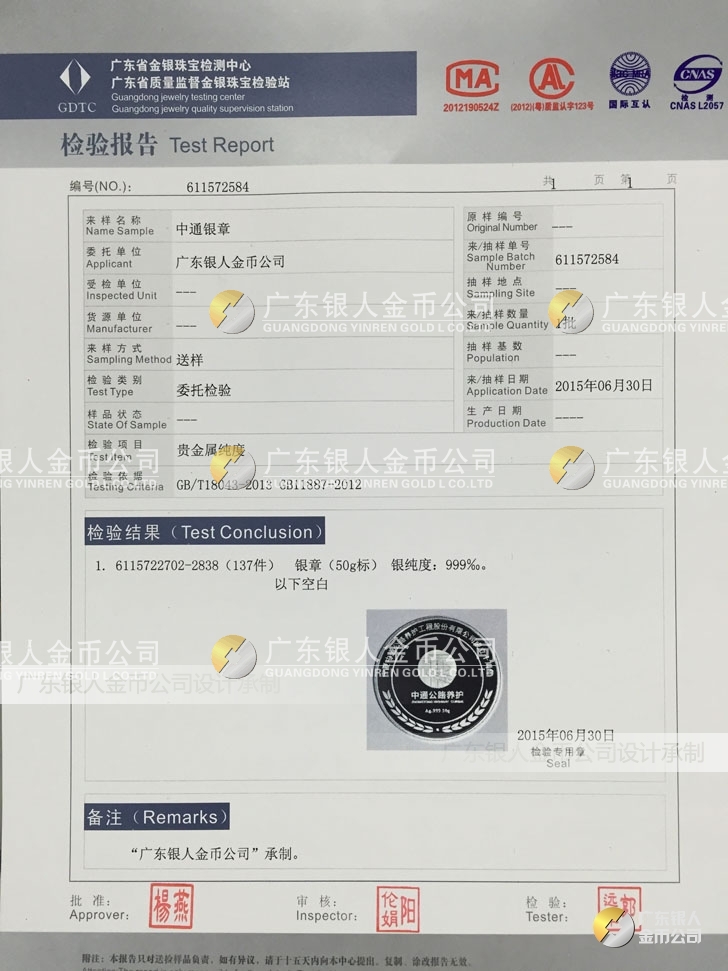 廣東銀人金幣公司承接客戶個(gè)性化定制的金銀幣、金銀章、金銀條、金銀牌、金銀盤均由國(guó)家質(zhì)監(jiān)部門、嚴(yán)格檢測(cè)、權(quán)威鑒定: