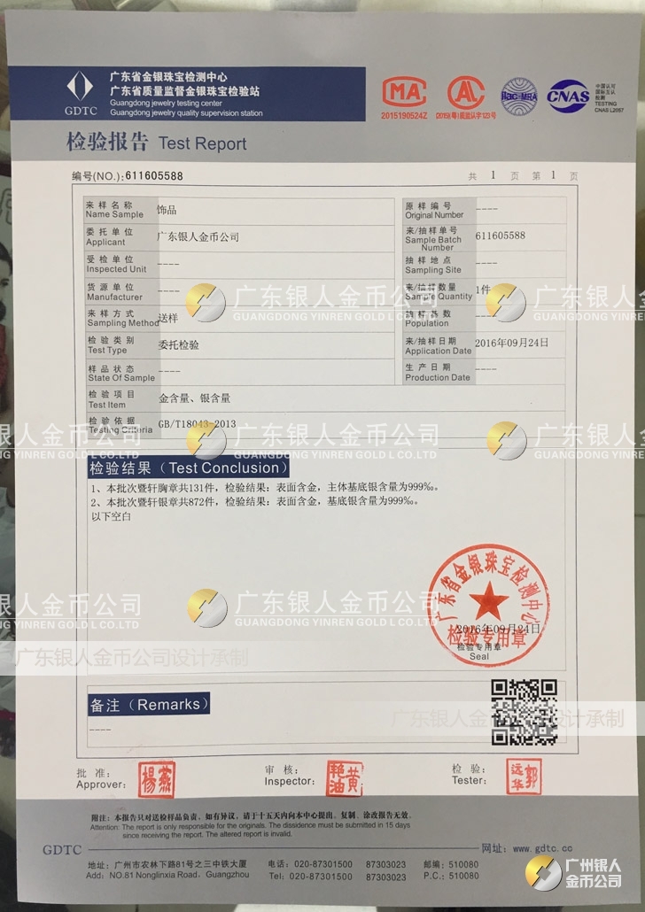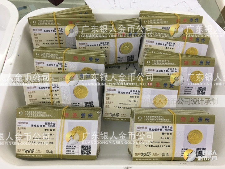 廣東銀人金幣公司承接客戶個(gè)性化定制的金銀幣、金銀章、金銀條、金銀牌、金銀盤均由國(guó)家質(zhì)監(jiān)部門、嚴(yán)格檢測(cè)、權(quán)威鑒定: